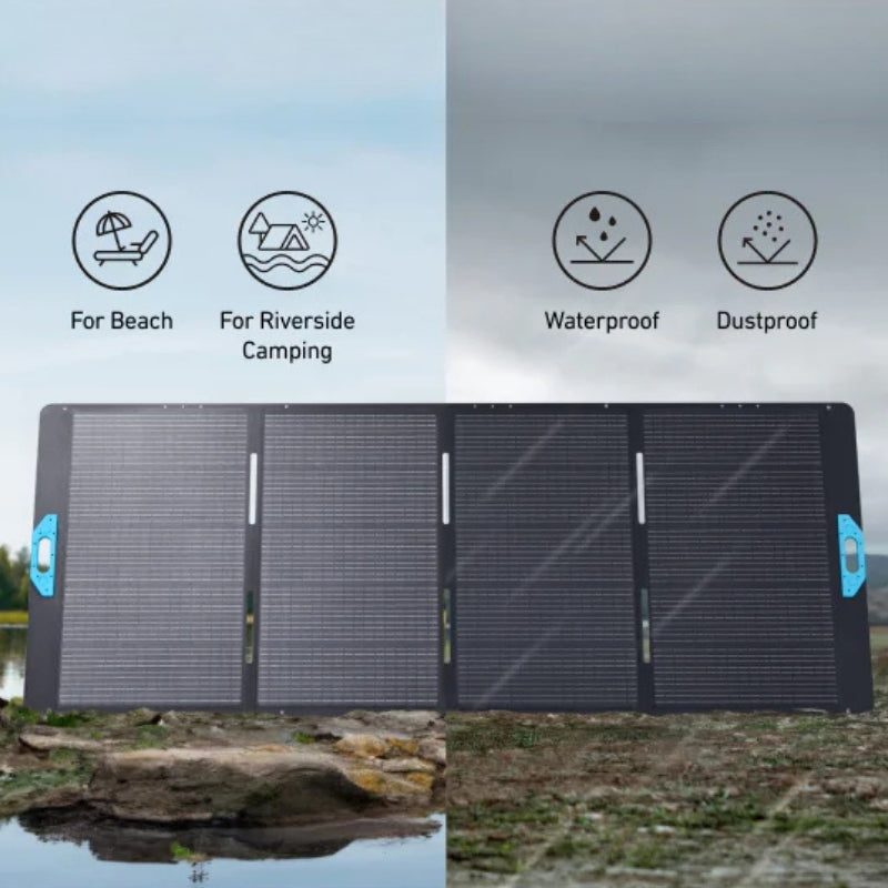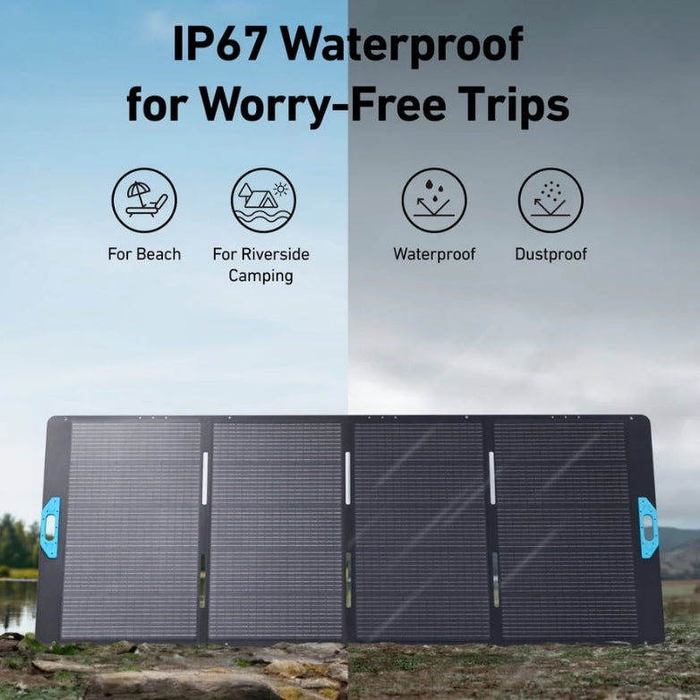 PS400 Solar Panel has an IP67 certification. It is waterproof and can be used in wet weather. However, the MC4 ports must be covered with the rubber plug before being exposed to rain or water.