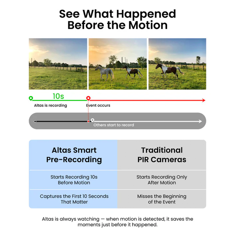 The default pre-recording time is 10s, adjustable between 2s and 10s. It is recommended to use it with a solar panel for a better pre-recording experience.